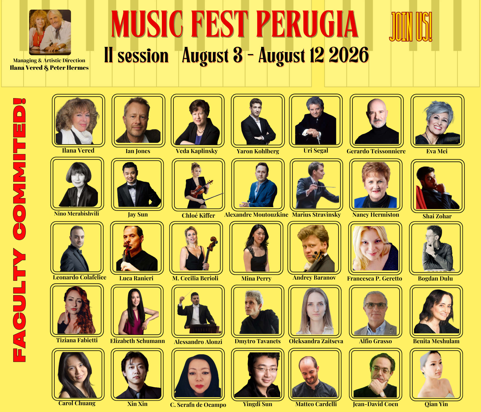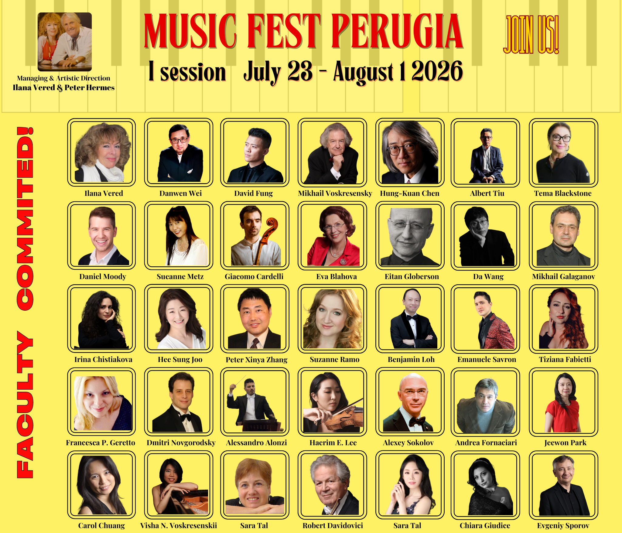 Among the great professors who came to MusicFest Perugia inspire us during the years: Gary Graffman, Jerome Lowenthal, John Perry, Boris Slutzki, Arie Vardi, Alexander Korsantia, Joseph Kalichstein, Yuki Yokoyama, Sergei Babayan, Peter Frankl, Sharon Cristman, Luigi Alva, Bruno Pratico, Bruno De Simone, etc... While the festival has historically been based on young pianists, we have since gone on to incorporate vocalists and strings (Eva Mei and Jennifer Larmore).