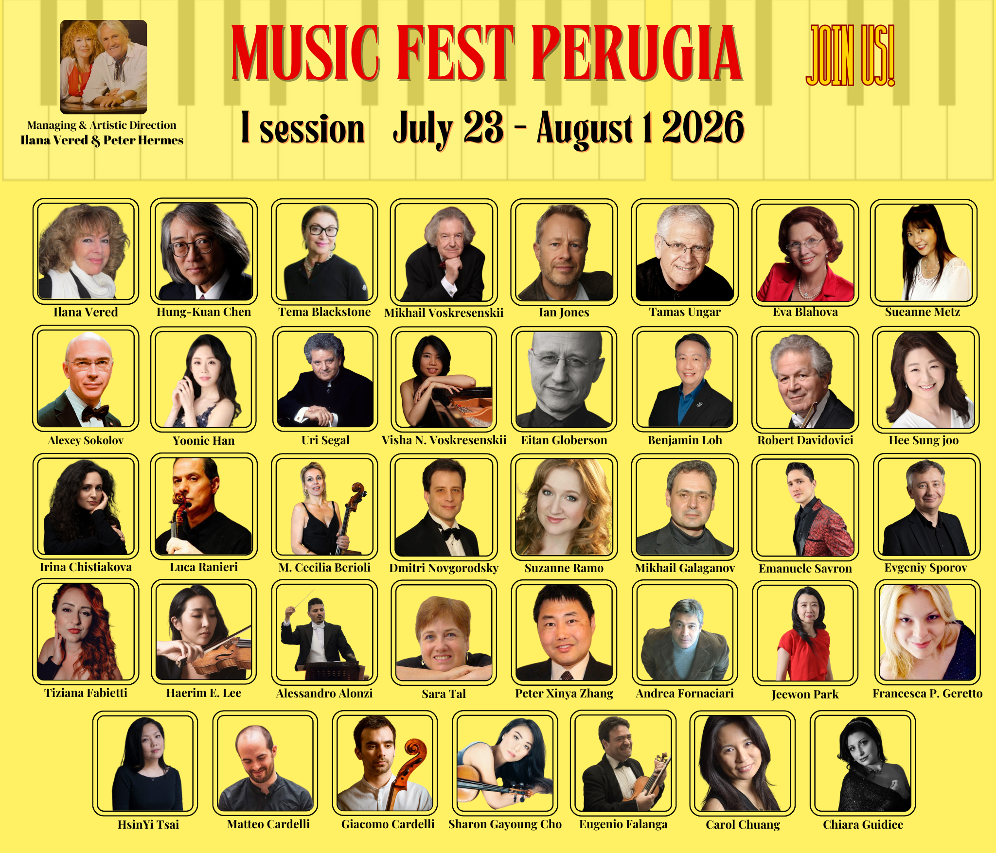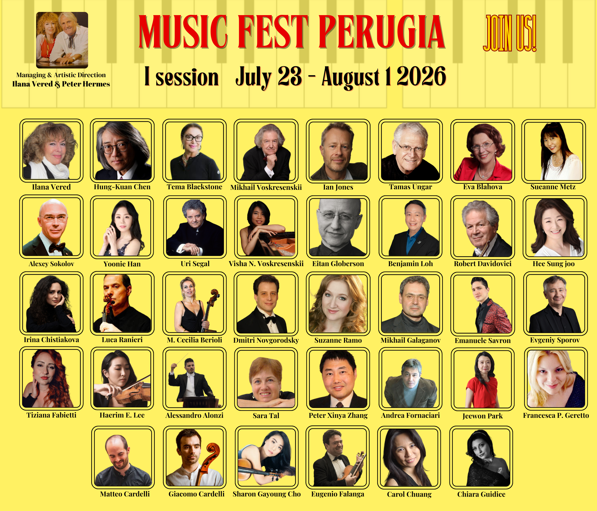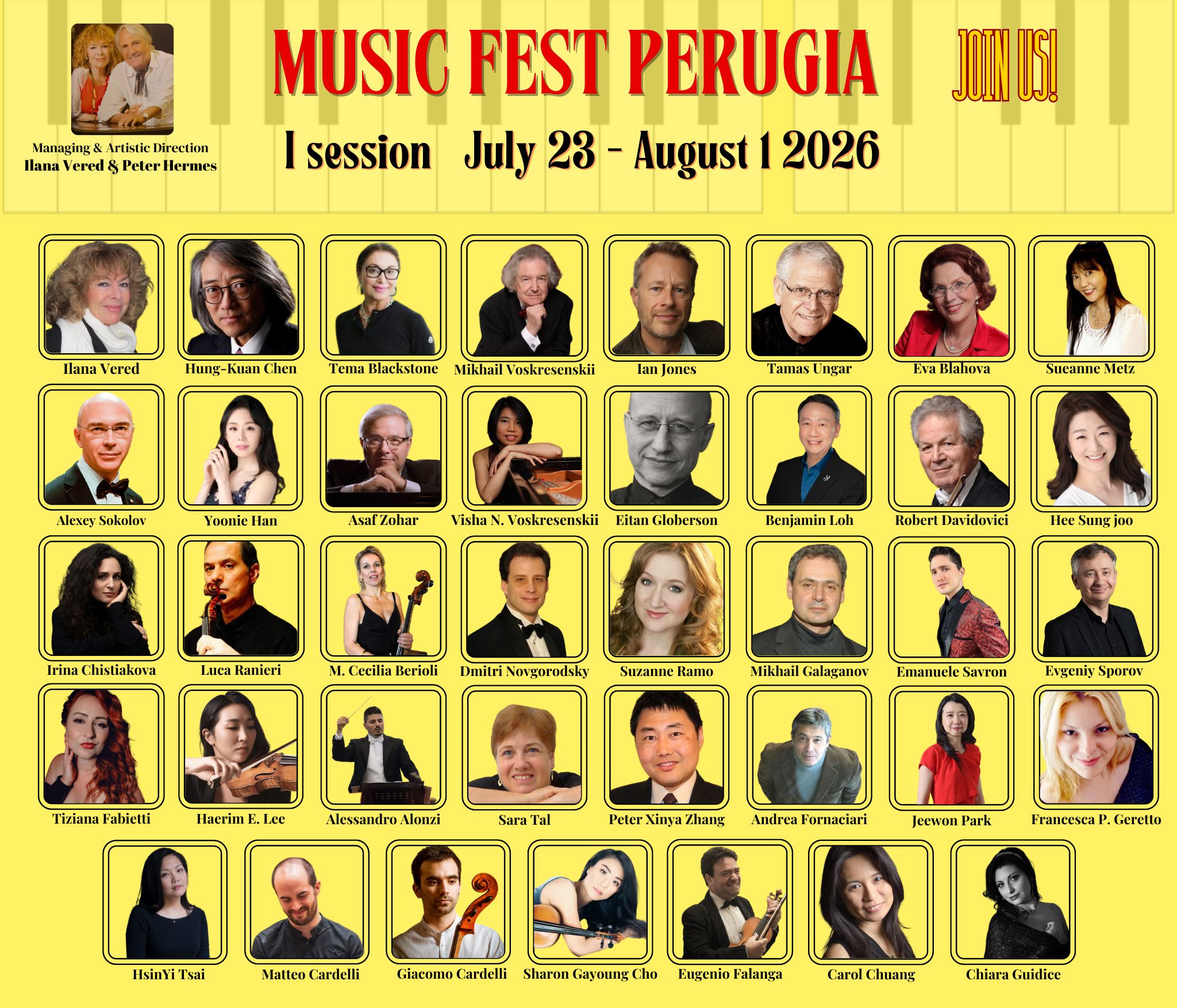 Among the great professors who came to MusicFest Perugia inspire us during the years: Gary Graffman, Jerome Lowenthal, John Perry, Boris Slutzki, Arie Vardi, Alexander Korsantia, Joseph Kalichstein, Yuki Yokoyama, Sergei Babayan, Peter Frankl, Sharon Cristman, Luigi Alva, Bruno Pratico, Bruno De Simone, etc... While the festival has historically been based on young pianists, we have since gone on to incorporate vocalists and strings (Eva Mei and Jennifer Larmore).