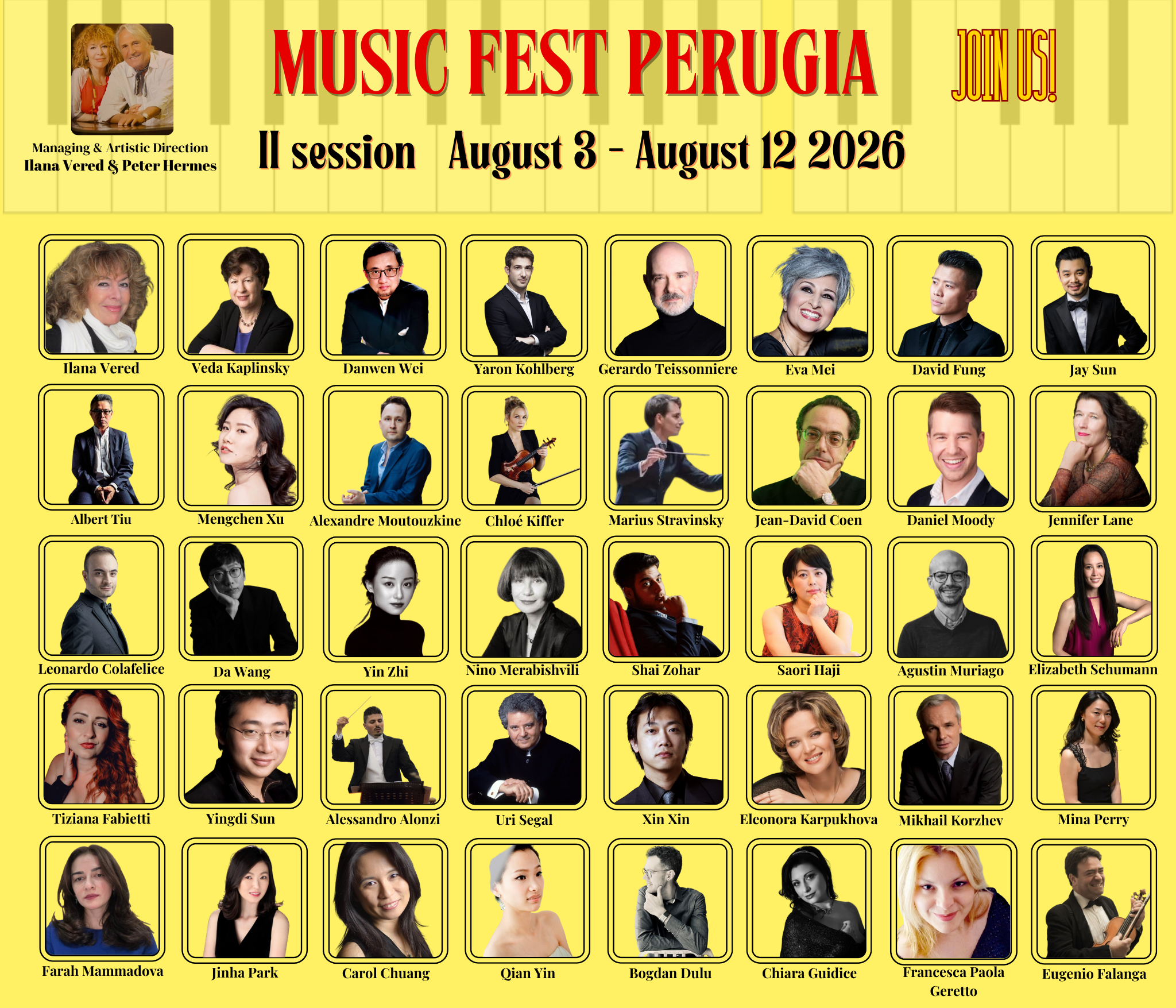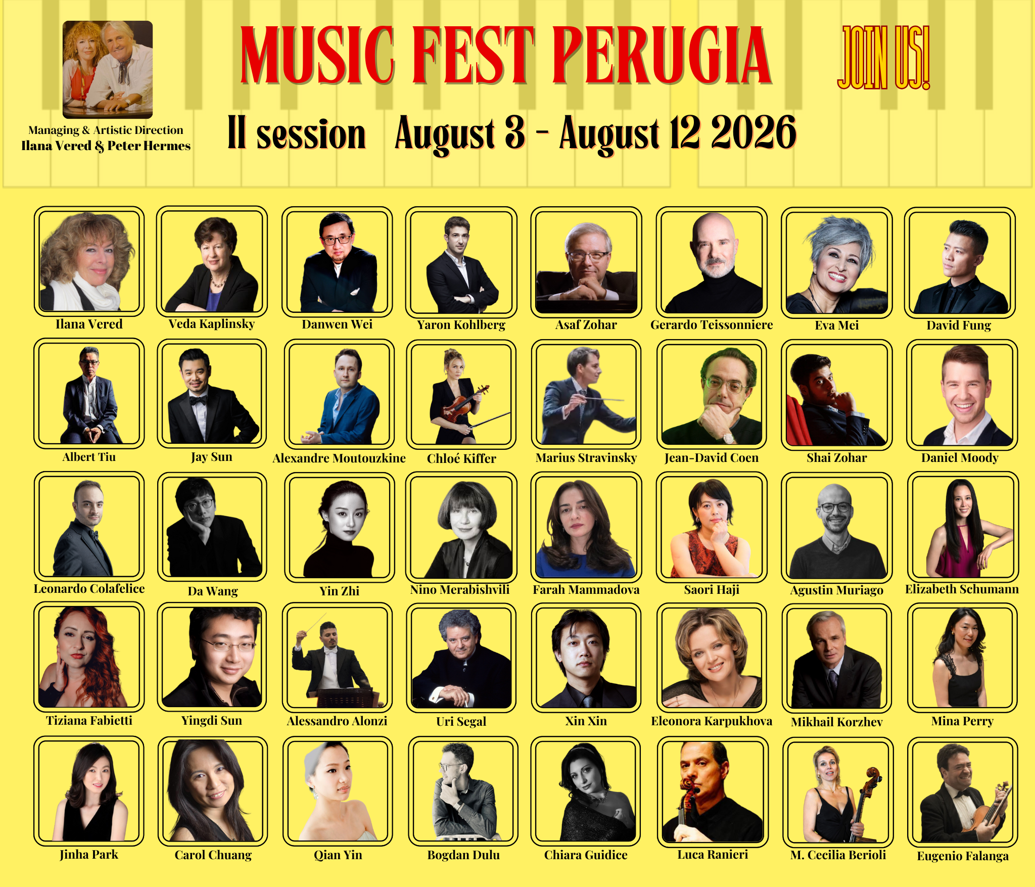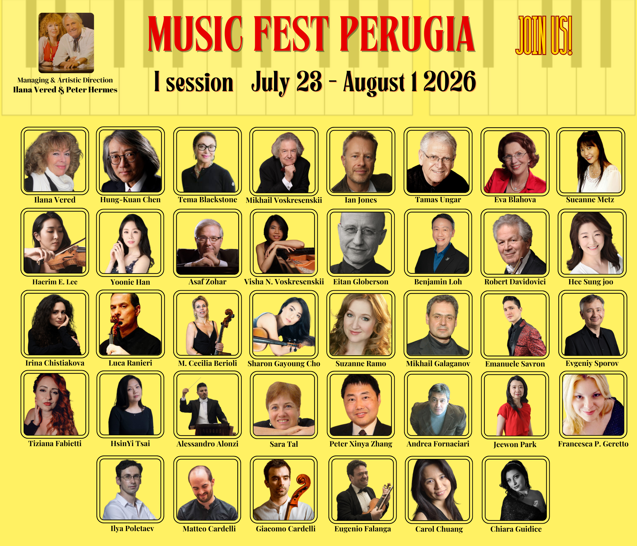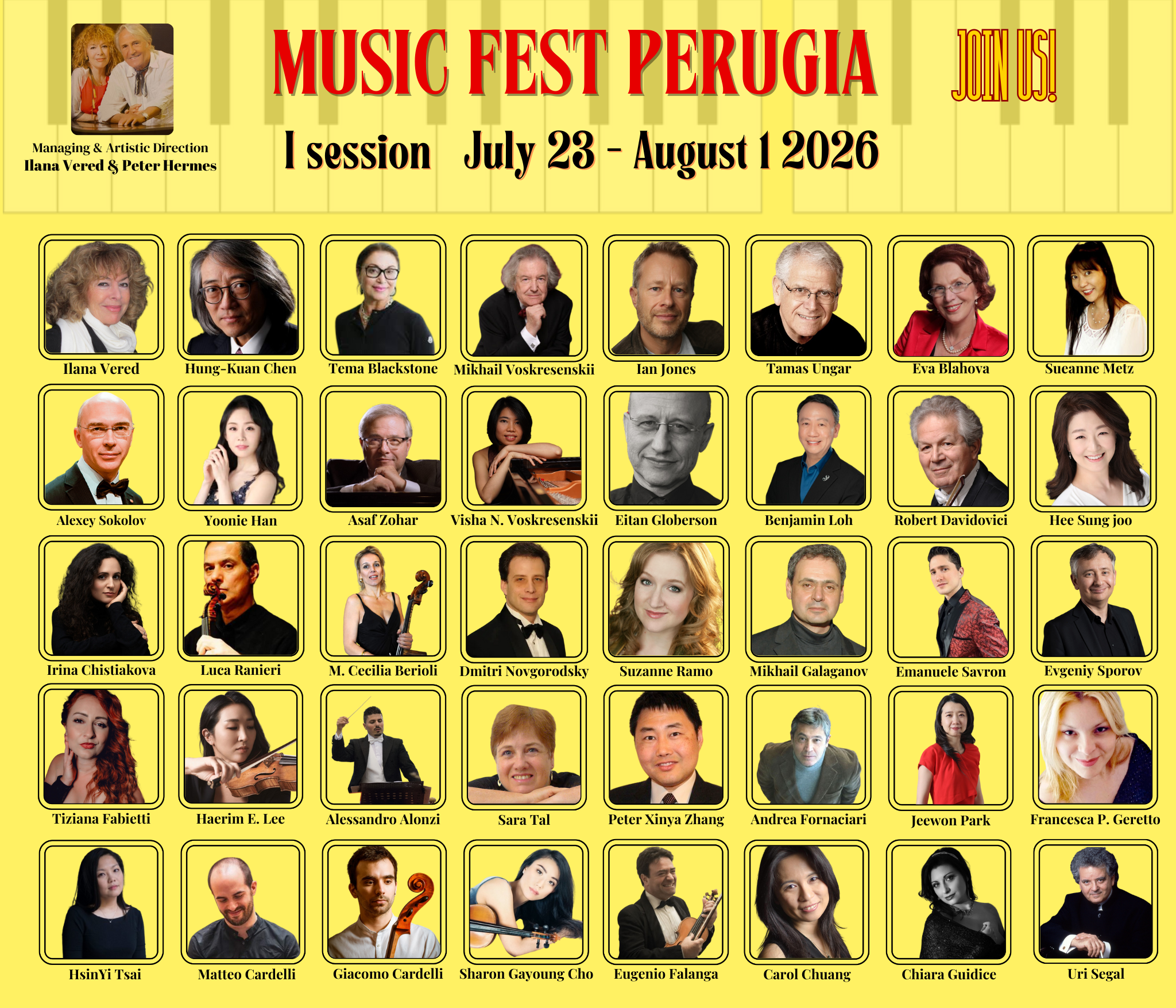 Among the great professors who came to MusicFest Perugia inspire us during the years: Gary Graffman, Jerome Lowenthal, John Perry, Boris Slutzki, Arie Vardi, Alexander Korsantia, Joseph Kalichstein, Yuki Yokoyama, Sergei Babayan, Peter Frankl, Sharon Cristman, Luigi Alva, Bruno Pratico, Bruno De Simone, etc... While the festival has historically been based on young pianists, we have since gone on to incorporate vocalists and strings (Eva Mei and Jennifer Larmore).